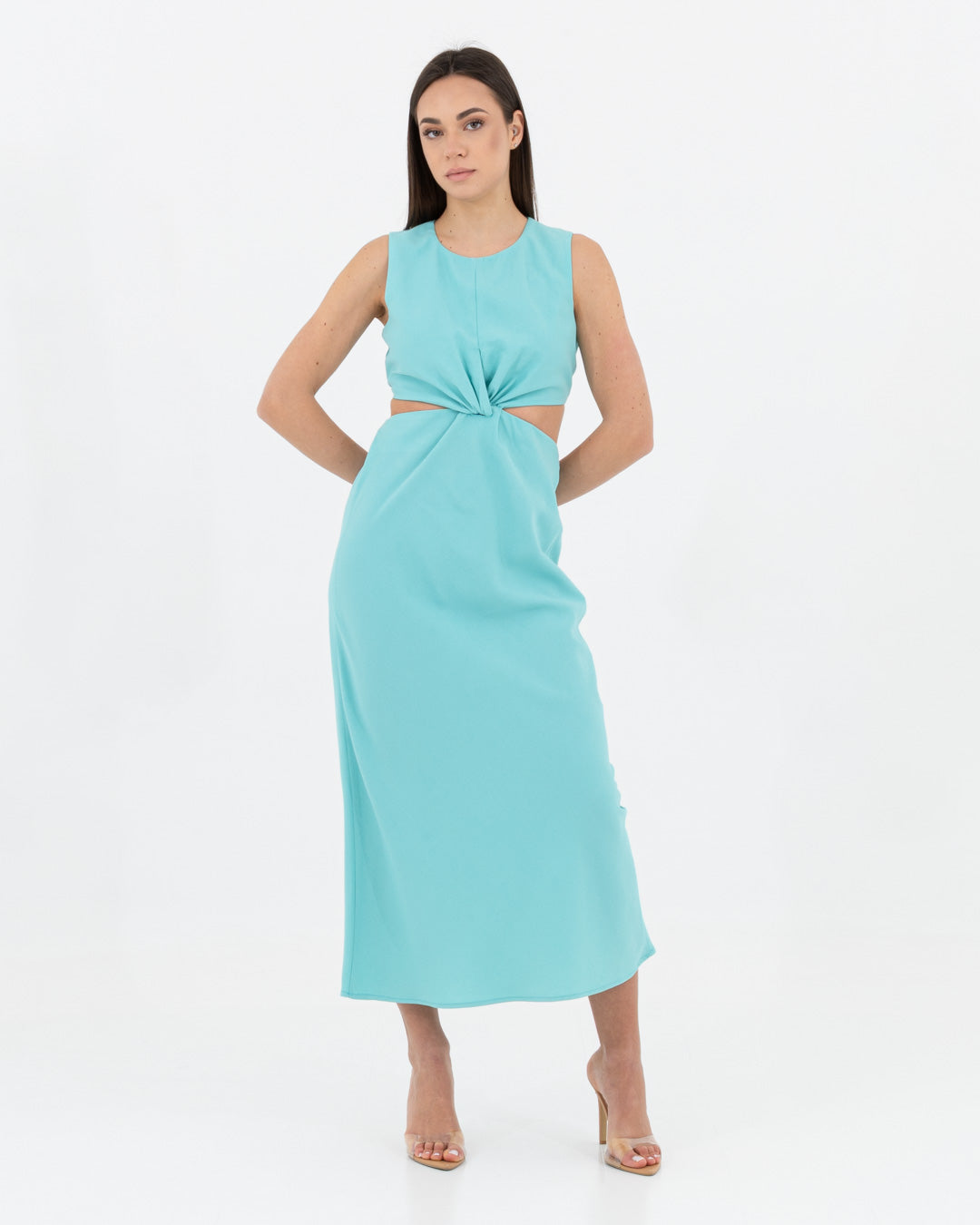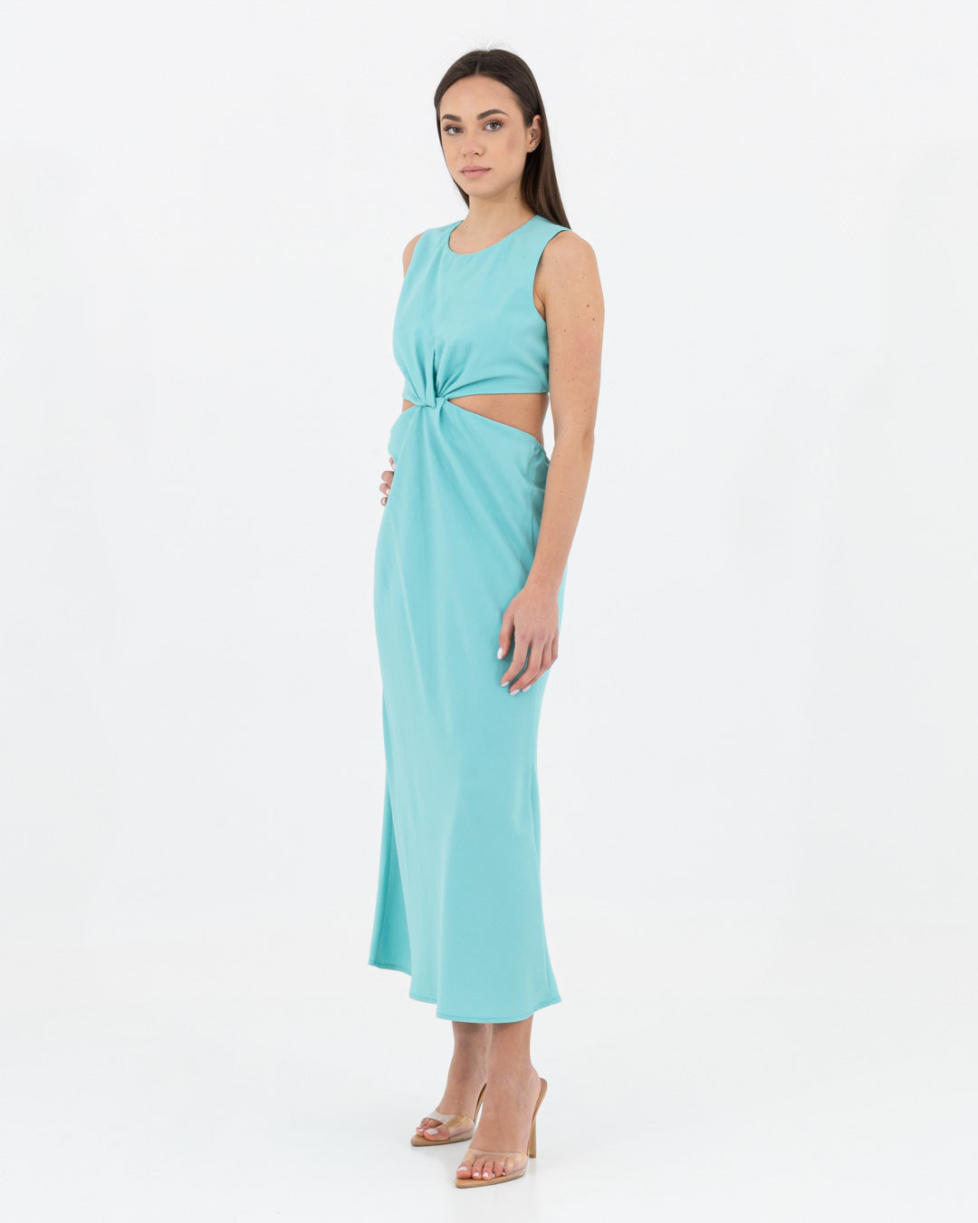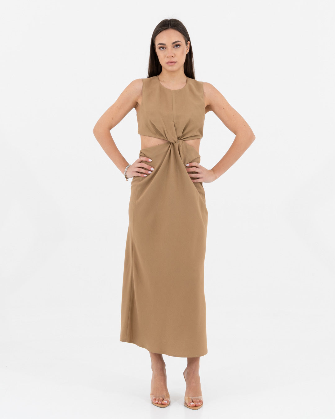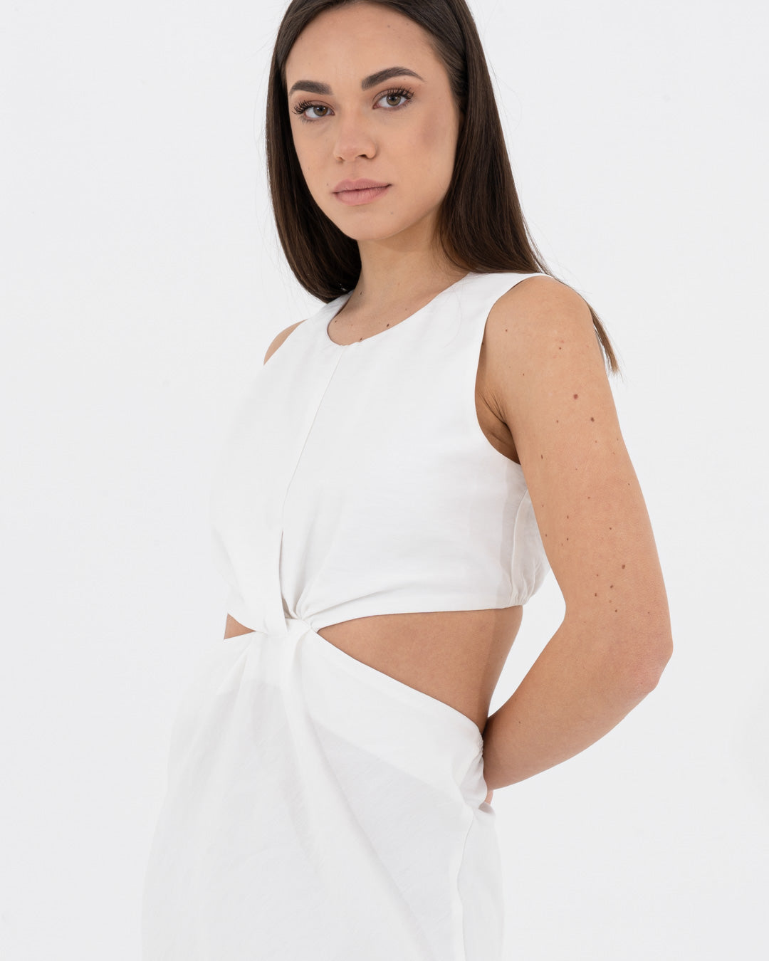 Sophisticated, modern and full of personality: this dress is a hymn to contemporary femininity. Made of viscose, it offers a fluid and light texture that caresses the body with elegance. The design is characterized by a refined play of side cut-outs and a front knot, which sculpts the silhouette creating a defined waist and a visually impactful effect.