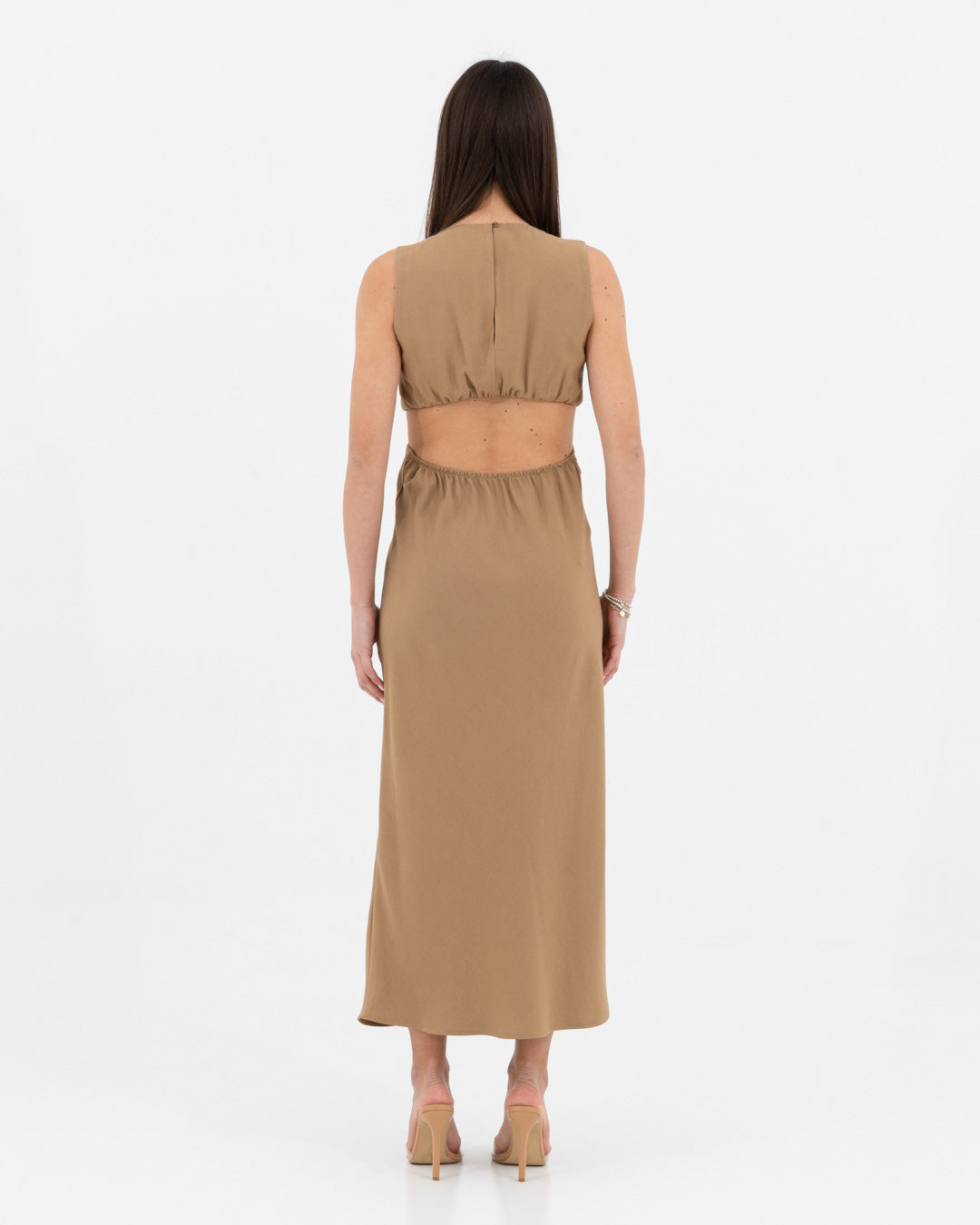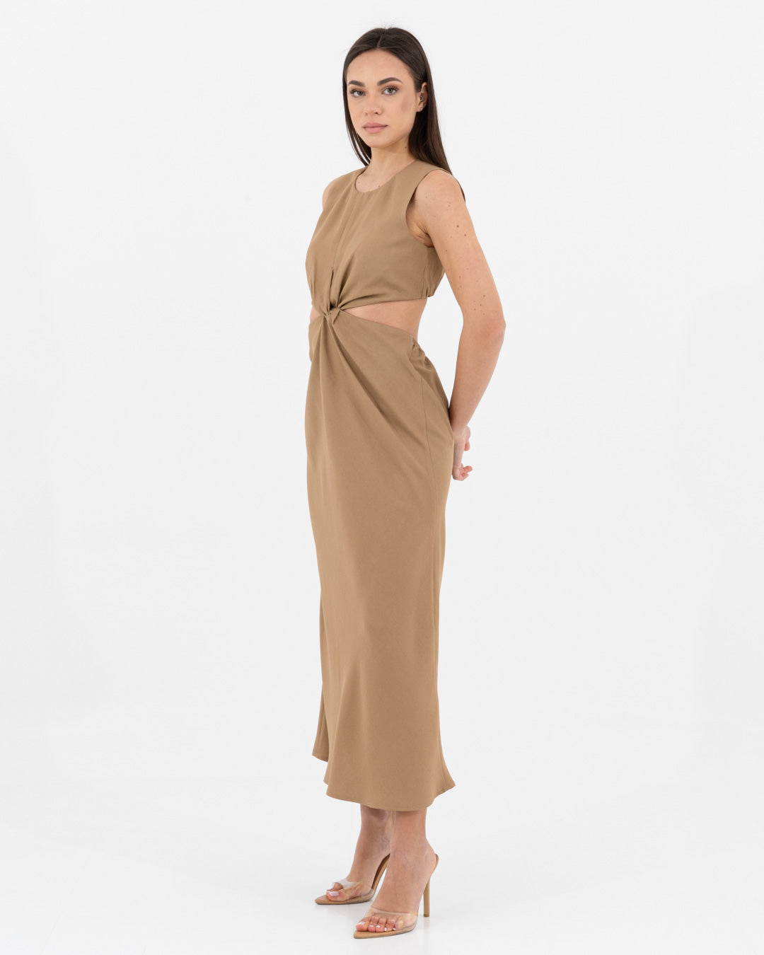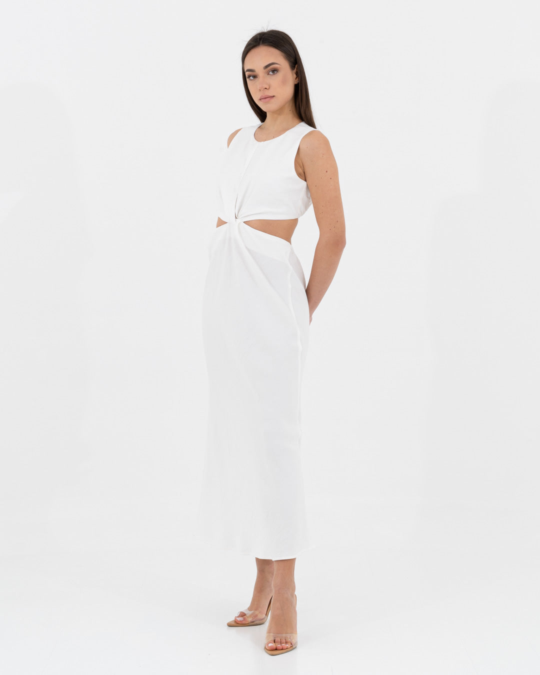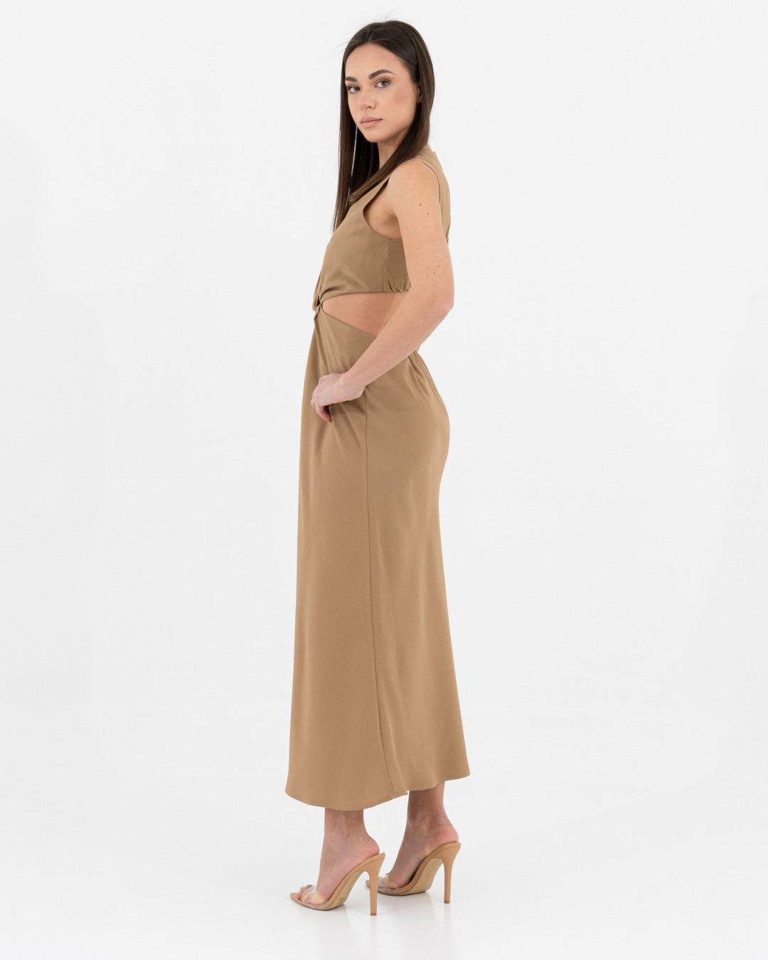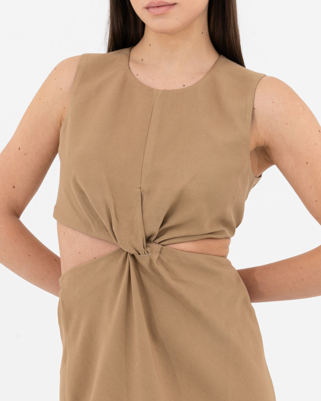 Sophisticated, modern and full of personality: this dress is a hymn to contemporary femininity. Made of viscose, it offers a fluid and light texture that caresses the body with elegance. The design is characterized by a refined play of side cut-outs and a front knot, which sculpts the silhouette creating a defined waist and a visually impactful effect.