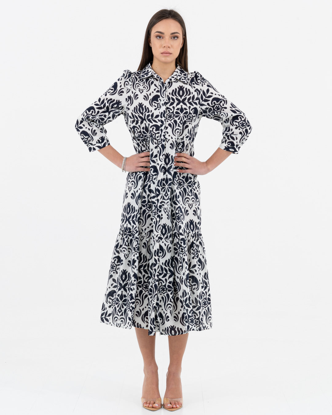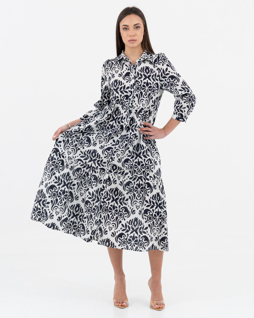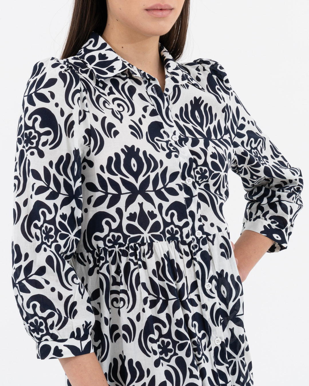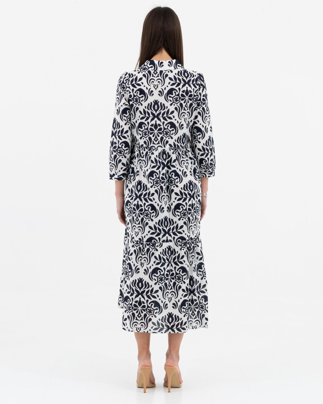 Fresh, refined and full of charm: this summer dress is the quintessence of Mediterranean style. The abstract white and blue pattern gives an artistic and vibrant touch, perfect for brightening up the hottest days with elegance and lightness. The soft line guarantees comfort and freedom of movement, without sacrificing femininity. Made of cotton, this dress is perfect for walks by the sea, outdoor brunches or informal events where you can stand out with taste.