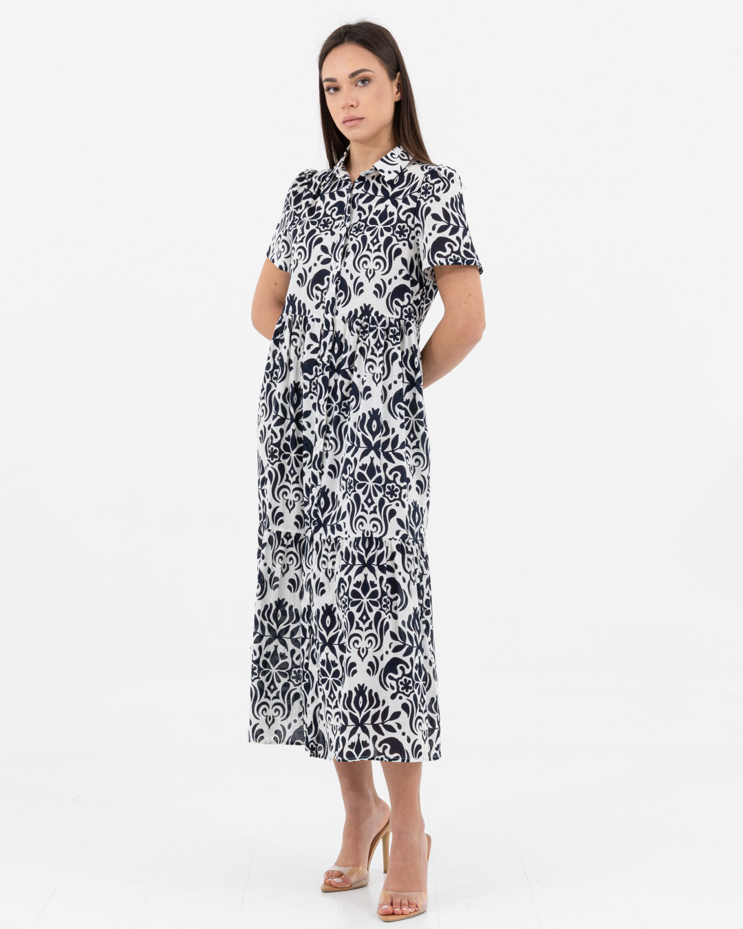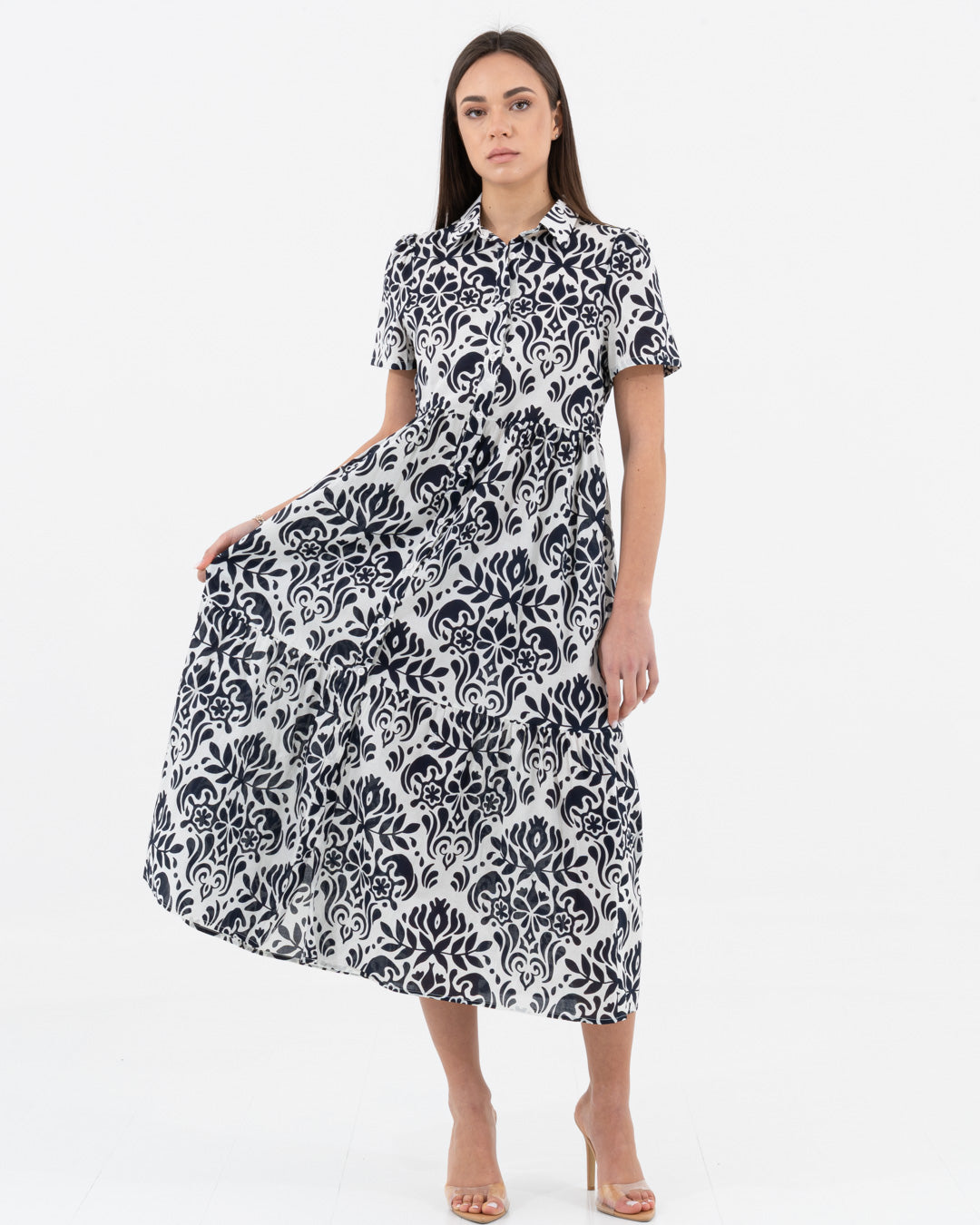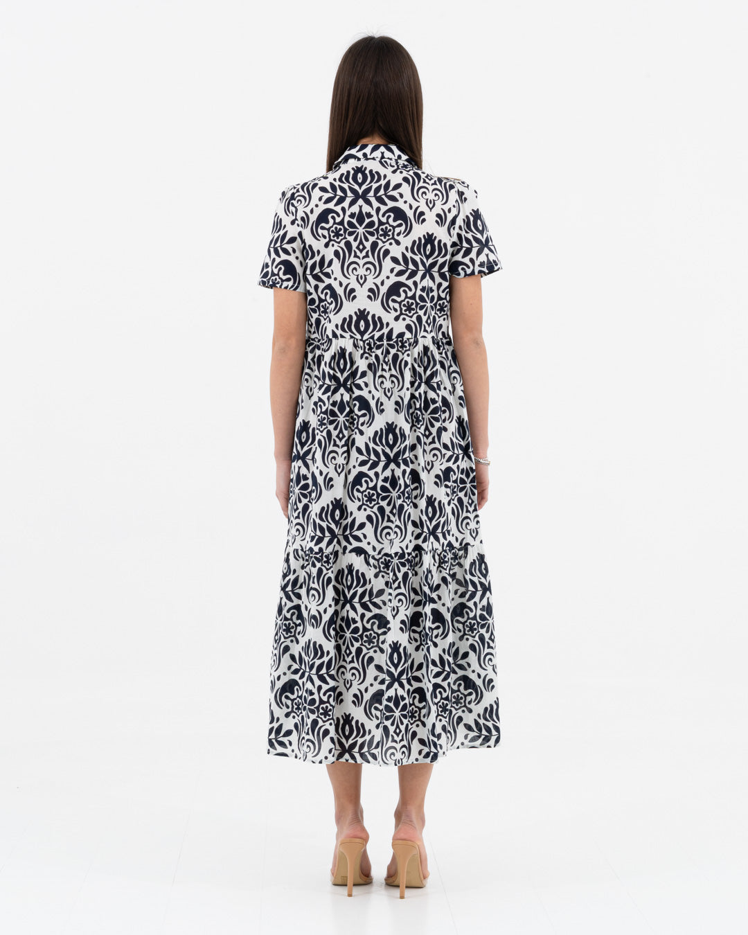 Fresh, refined and full of charm: this summer dress is the quintessence of Mediterranean style. The abstract white and blue pattern gives an artistic and vibrant touch, perfect for brightening up the hottest days with elegance and lightness. Made of cotton, this dress is perfect for walks by the sea, outdoor brunches or informal events where you can stand out with taste.