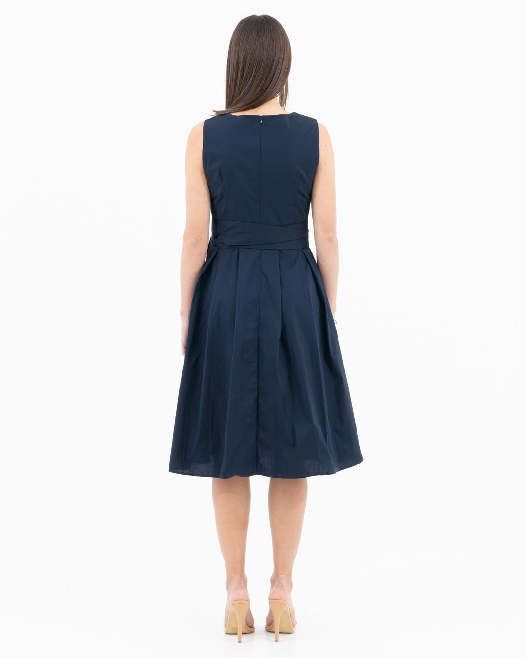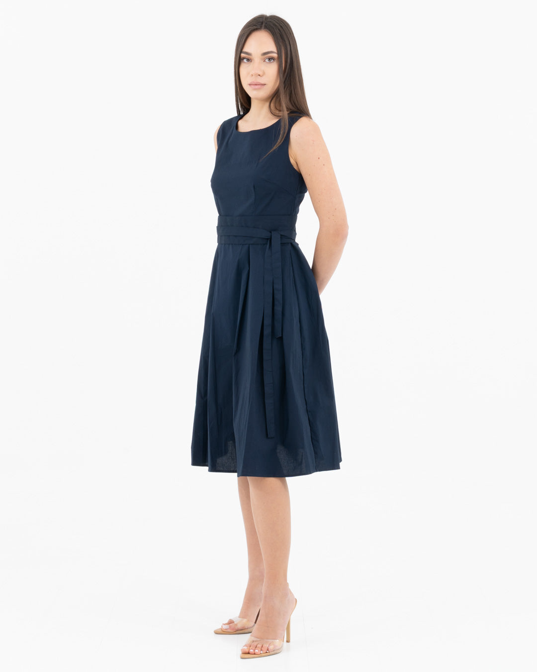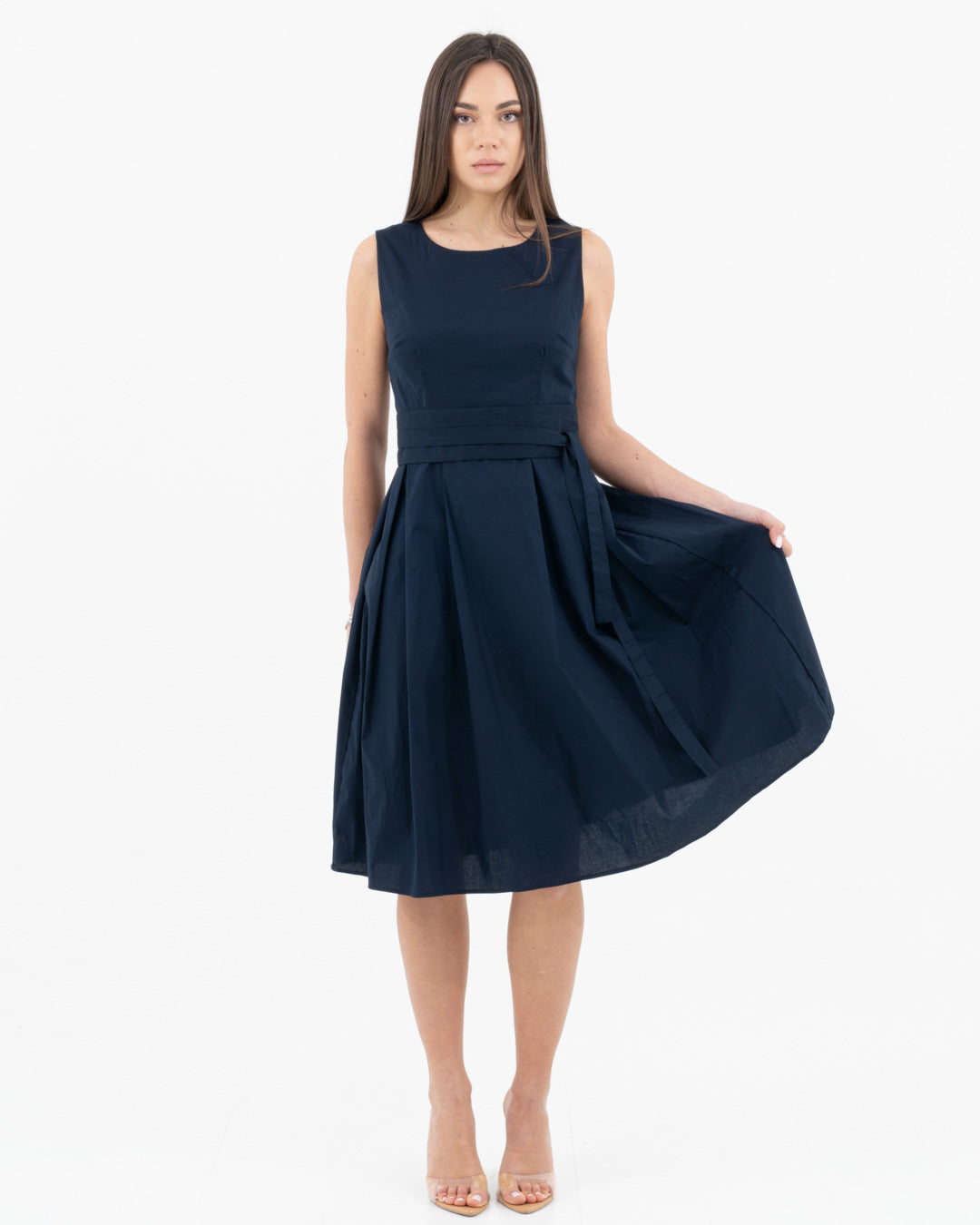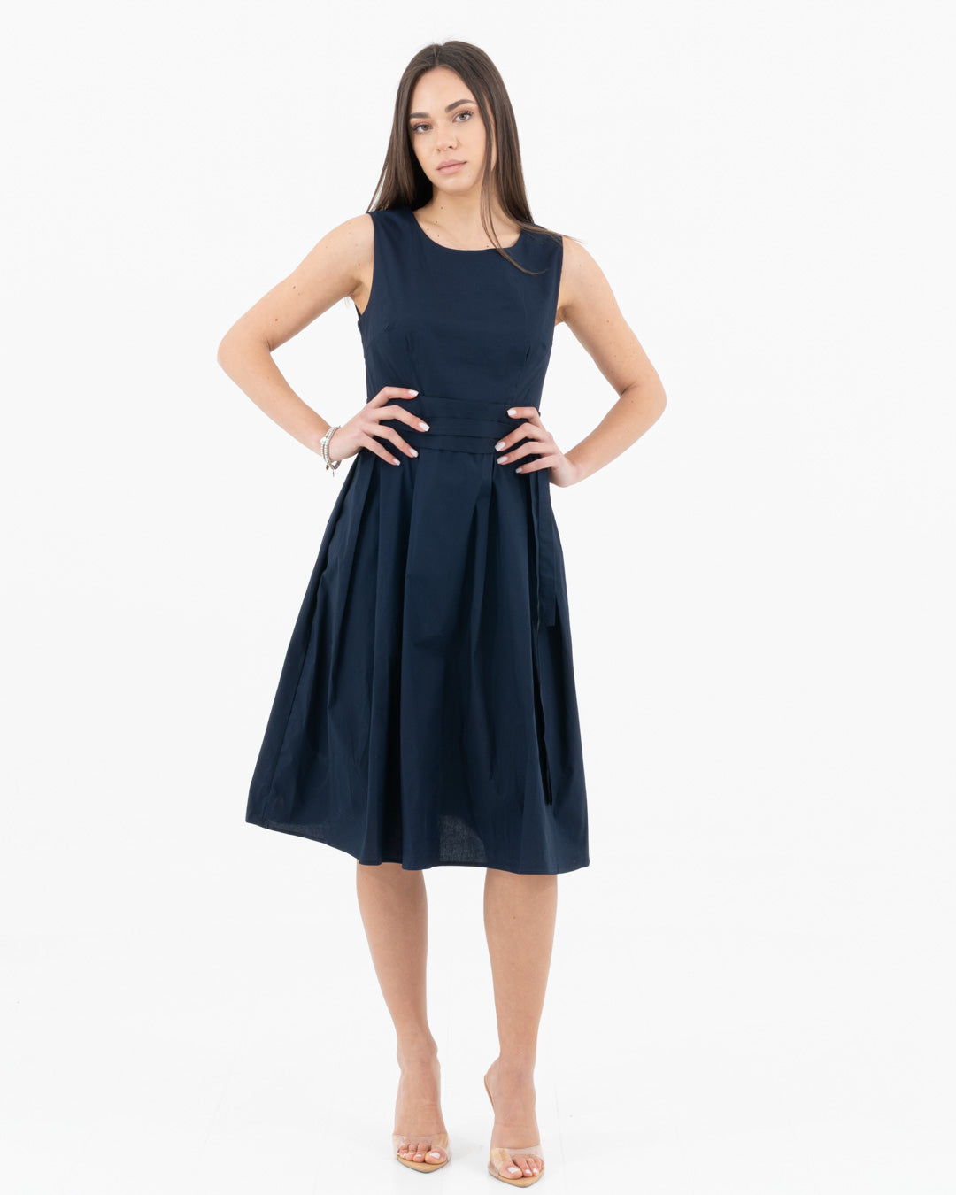 Timeless elegance and impeccable comfort come together in this sleeveless blue dress. Made of cotton, the dress has a perfect fit that glides gently over the figure, thanks to its harmonious line and tailored details. The front darts give a sophisticated structure to the garment, accentuating the silhouette with discretion. The sleeveless design makes it perfect for warmer days, while the classic blue color adds a touch of sophistication and versatility, suitable for any occasion, from work to evening events.
