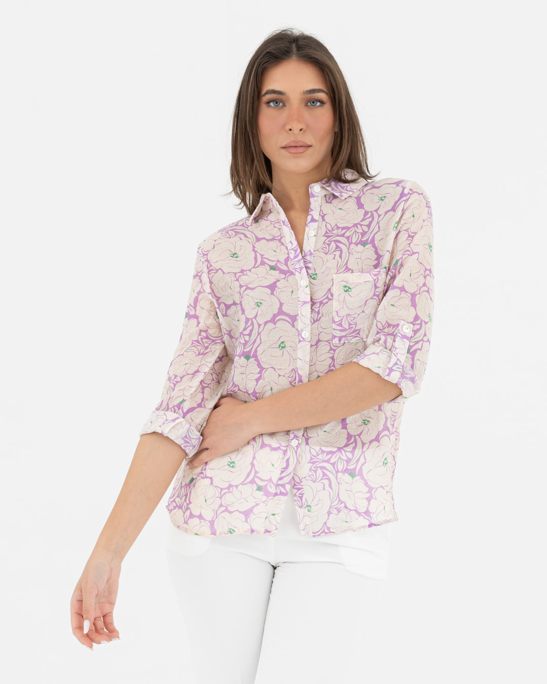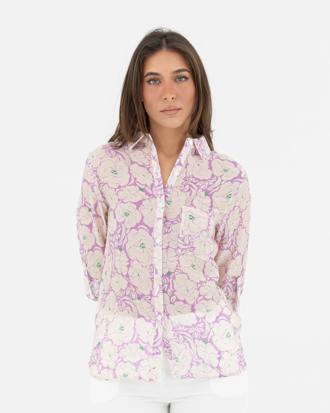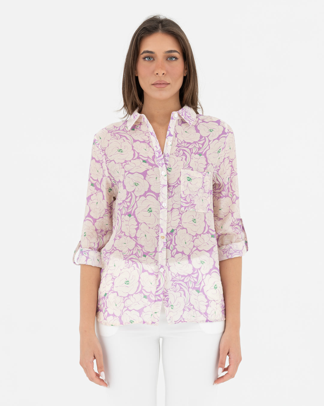 Express your style with delicacy and personality thanks to this semi-sheer rayon shirt. Light as a caress on the skin, it stands out for its refined floral pattern in shades of purple, green and ivory. The fluid design is completed by tone-on-tone buttons that run along the front closure and decorate the sleeves, allowing them to be elegantly rolled up for a more casual look. The soft cut and airy fabric make it ideal to wear with slim trousers.