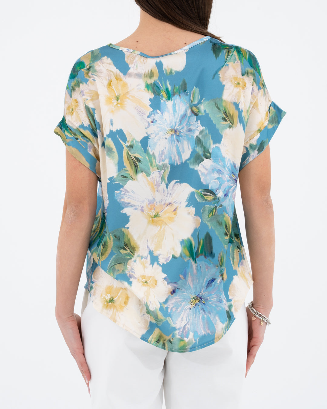 Update your wardrobe with the viscose satin blouse, a piece that combines grace and comfort in a refined design. The fluid and silky fabric glides on the skin with an incomparable softness, creating a light and sophisticated silhouette. The delicate and romantic floral pattern rests on a refined light blue background, evoking freshness and brightness. The rolled sleeves, a chic and modern detail, complete the look with a touch of lightness, making this blouse perfect for any occasion, from lunch in the city to an evening aperitif.