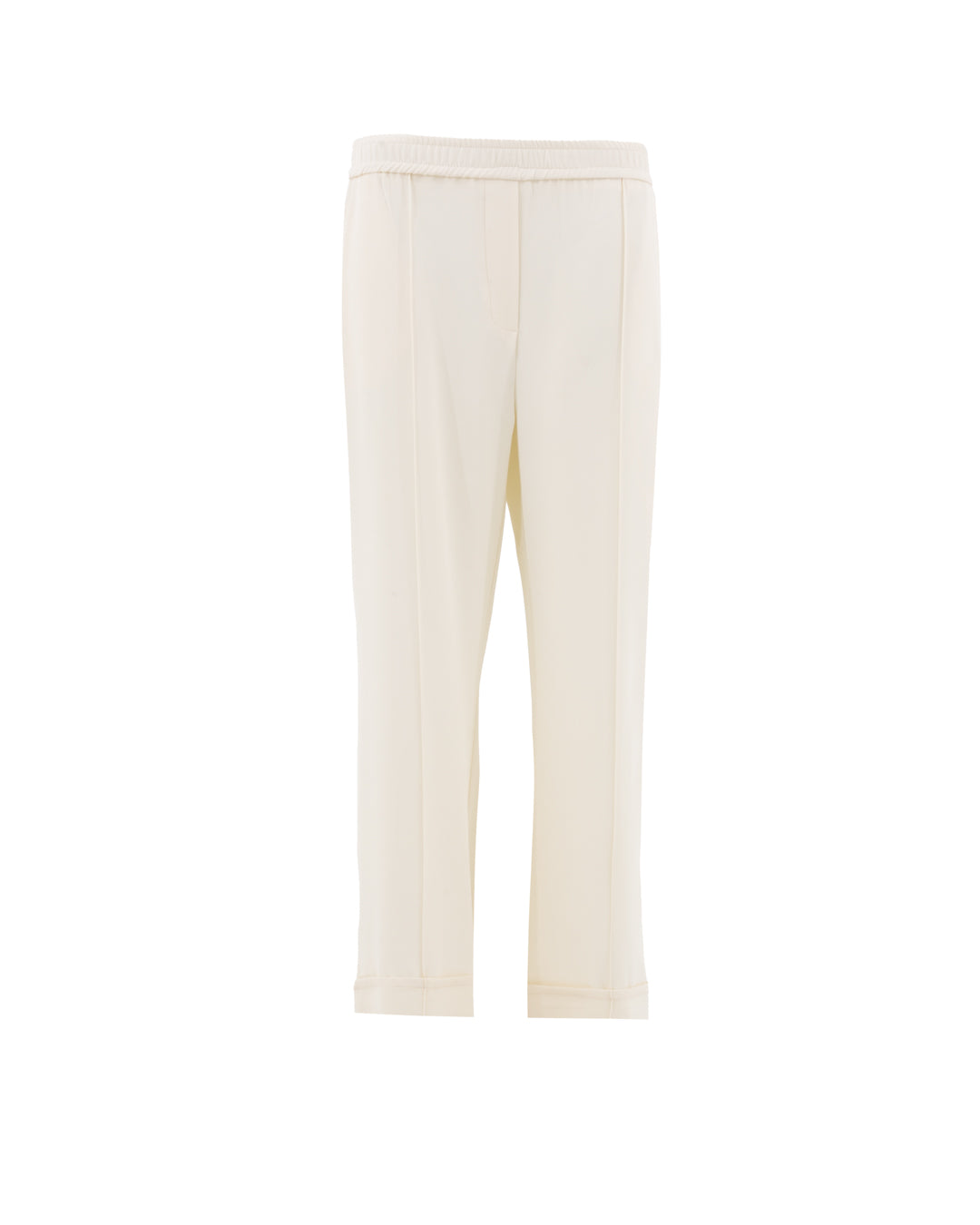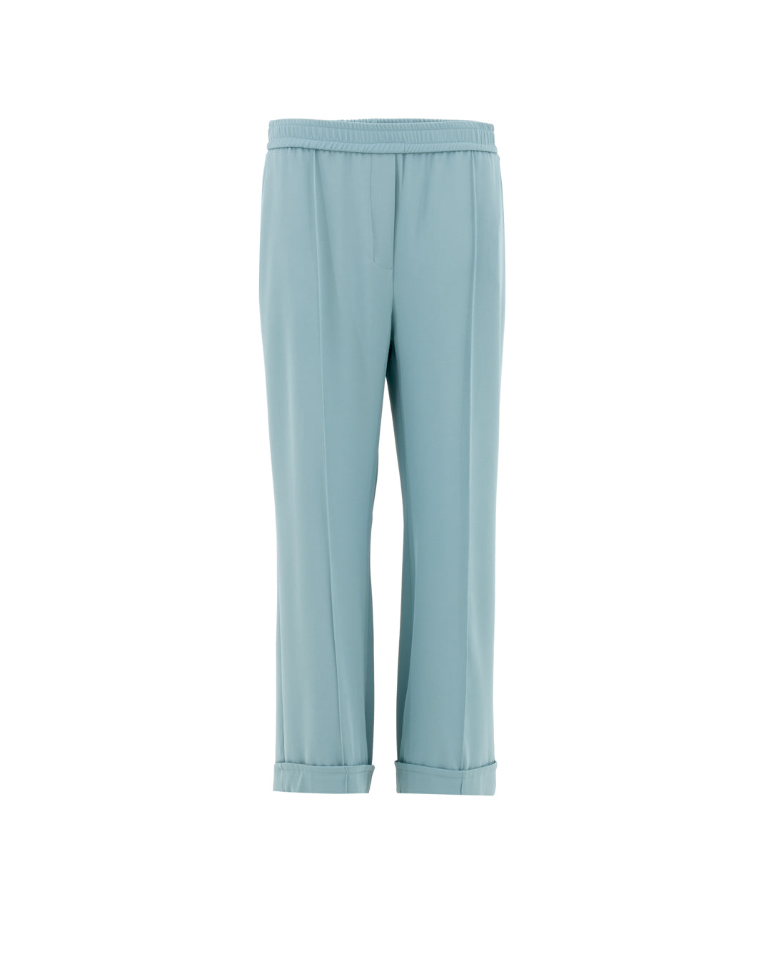 The trousers with elastic and cuff are the perfect synthesis between refinement and practicality. Their minimal and sophisticated design stands out for the wide and fluid leg, which enhances the silhouette with a touch of lightness and movement. Made of a soft and breathable fabric, these trousers ensure an impeccable fit and long-lasting comfort, perfect to accompany you at any time of the day. The elastic waist offers an adaptable and comfortable fit, while the cuff at the bottom adds a chic and contemporary detail.