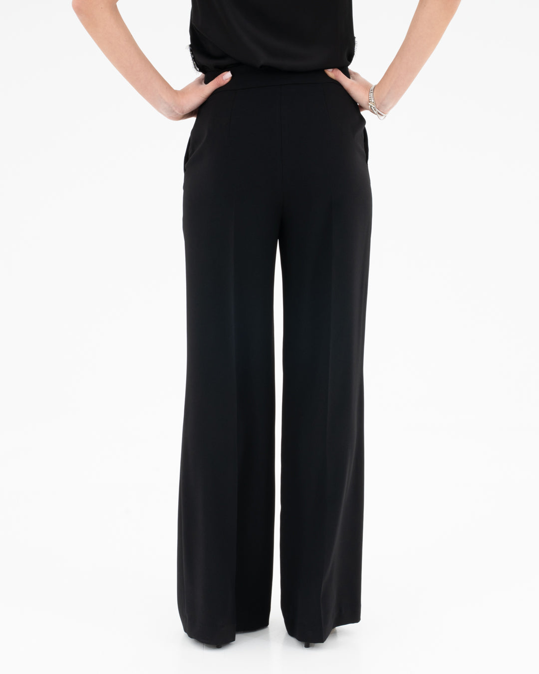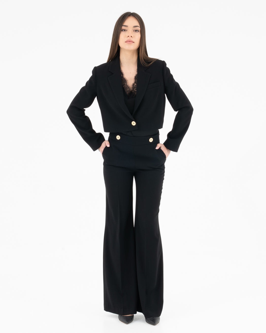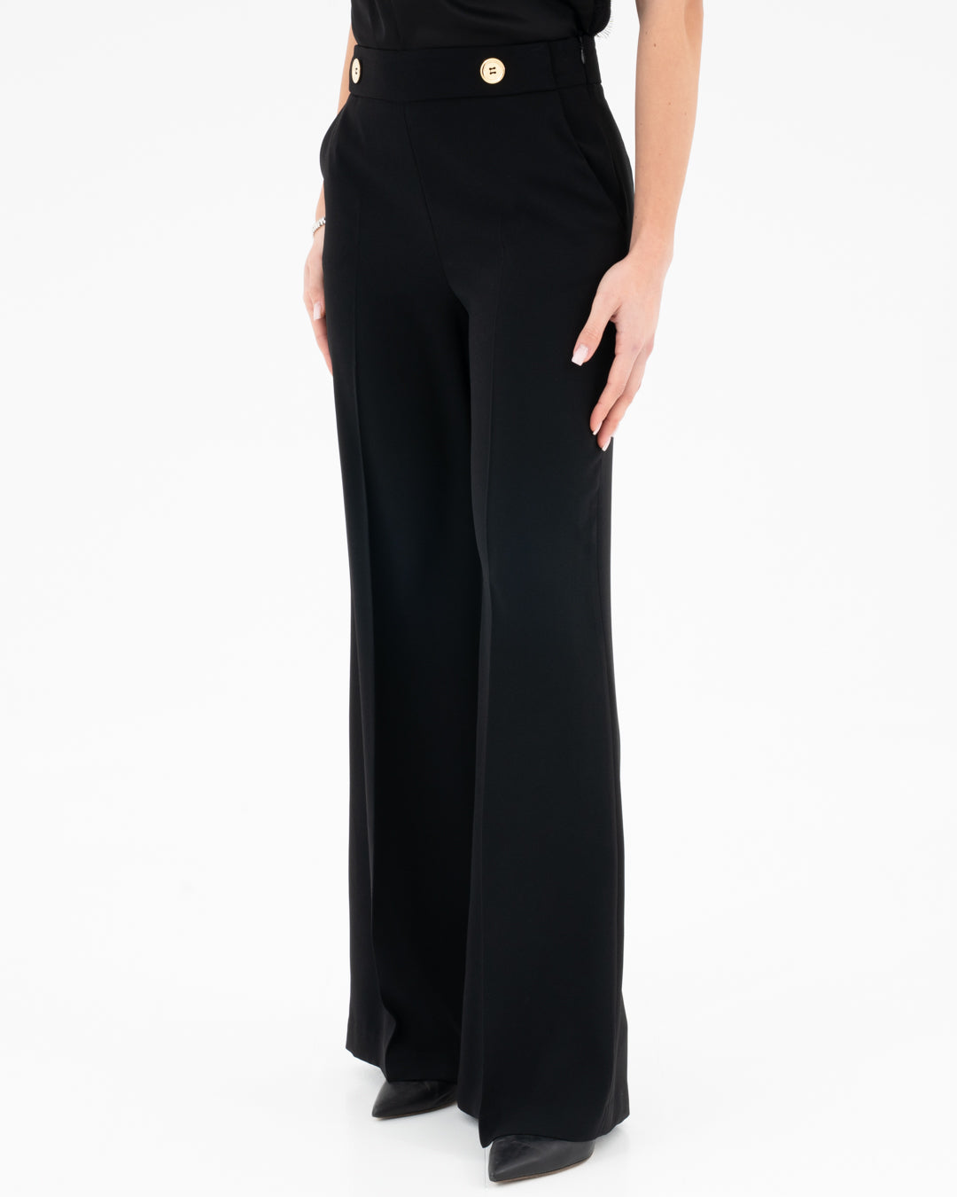 Add a touch of sophistication to your wardrobe with these high-waisted trousers with a sophisticated design. Featuring a wide and fluid line, they are embellished with elegant gold buttons on the belt that give a touch of class and uniqueness. Crafted from a light and comfortable fabric, they are perfect for a chic office look or for a special occasion. Pair them with a structured shirt for a formal outfit or with a basic top for minimalist elegance.