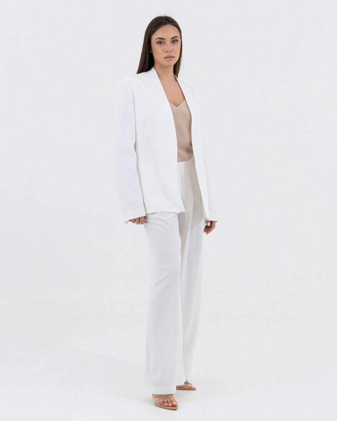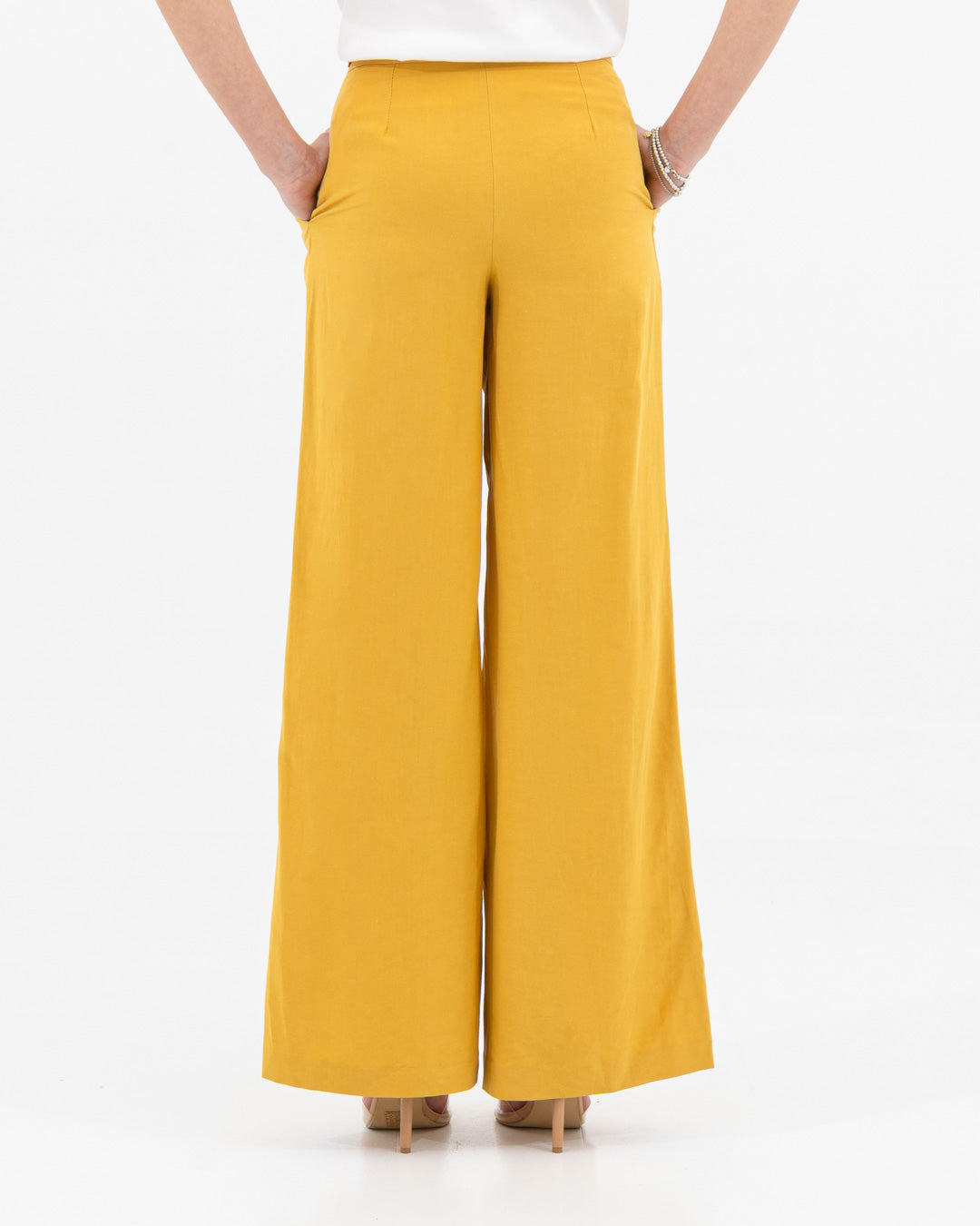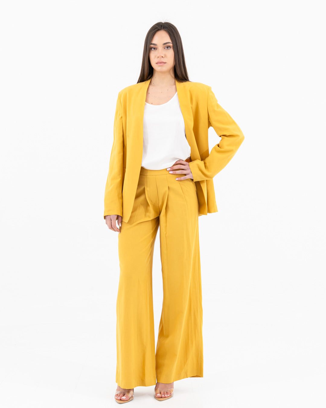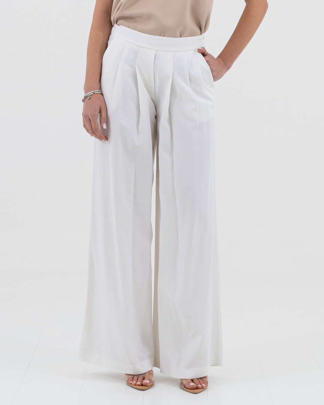 Lightness and effortless style define these wide trousers, an iconic and versatile garment designed for the contemporary woman. Made of a blend of viscose and linen, they offer a fluid and airy fit, ideal for elegantly facing the hottest days. The front pleats add a sartorial touch to the design, enhancing the silhouette with a soft and structured line at the same time. The wide leg slims the figure and gives movement, making these trousers perfect to combine with tight tops or flowing shirts. Try them also with the coordinated jacket.