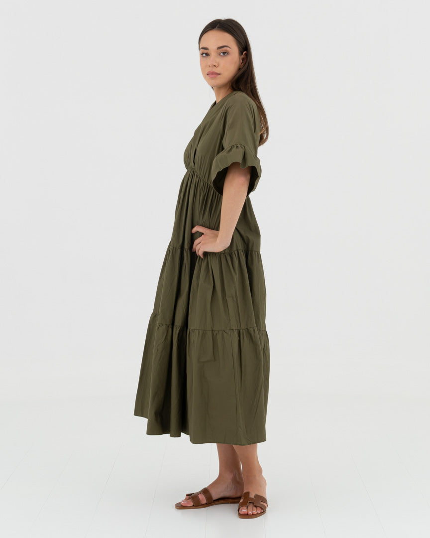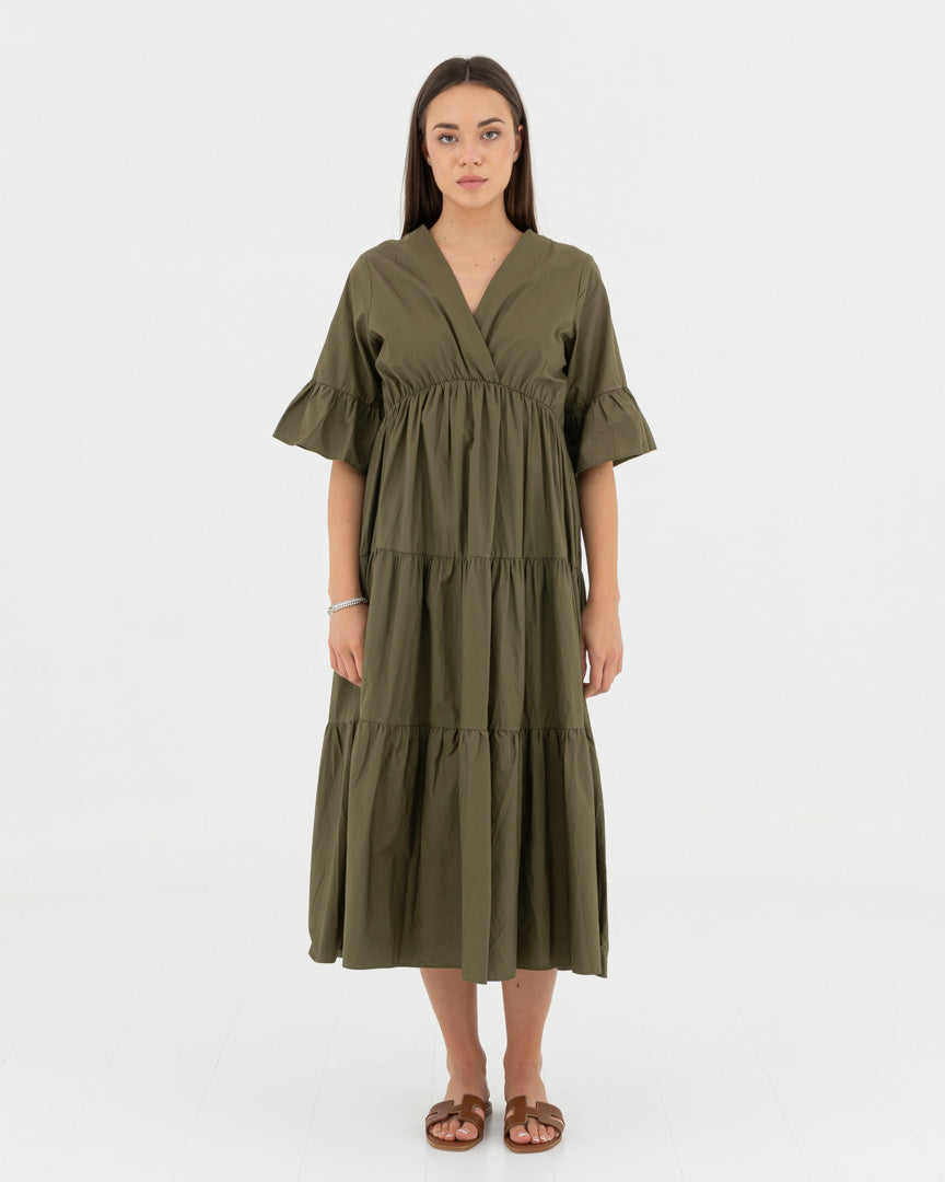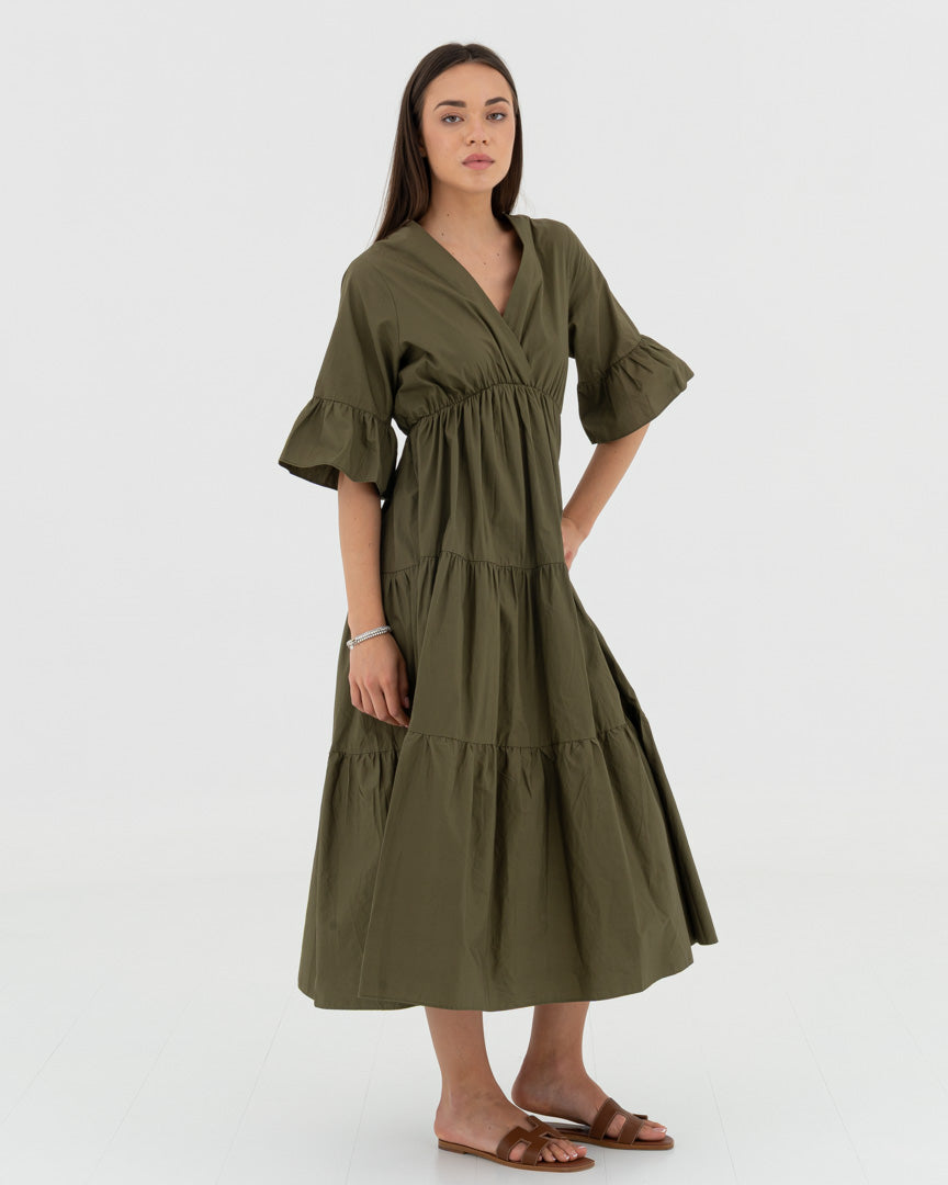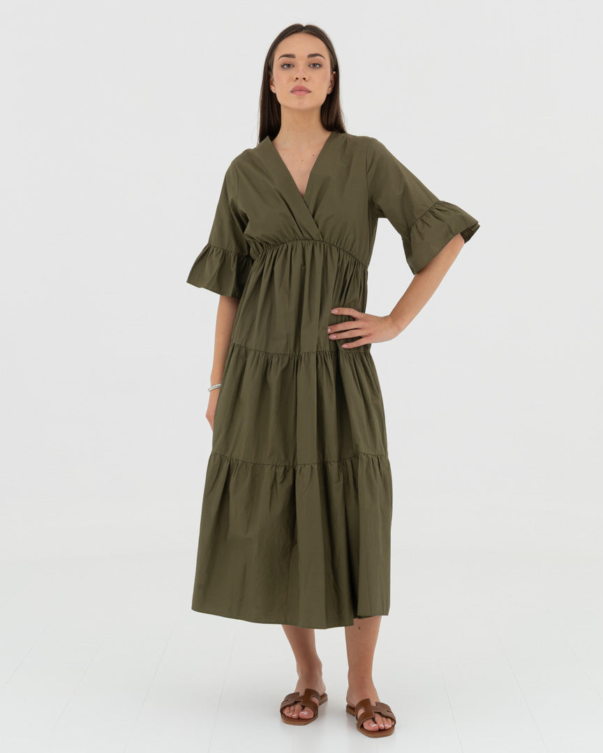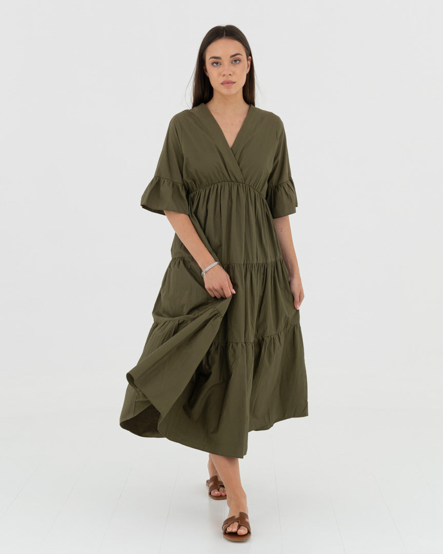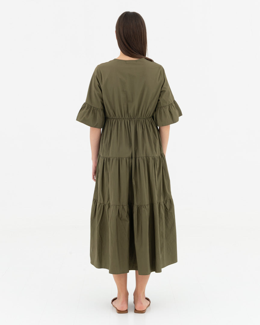 Un'eleganza leggera e senza tempo caratterizza questo abito in cotone, pensato per accompagnare con stile le giornate più calde. La gonna a balze crea movimento e volume, offrendo un’armonia visiva romantica e dinamica. Lo scollo a V slancia la figura e incornicia delicatamente il décolleté, mentre la mezza manica a campana aggiunge un tocco femminile, perfetto per chi ama i dettagli ricercati ma discreti. Leggero, traspirante e incredibilmente versatile, è il capo ideale per passeggiate in città, eventi informali o vacanze al sole. Basta un paio di sandali intrecciati o accessori in paglia per completare un look chic e disinvolto.
