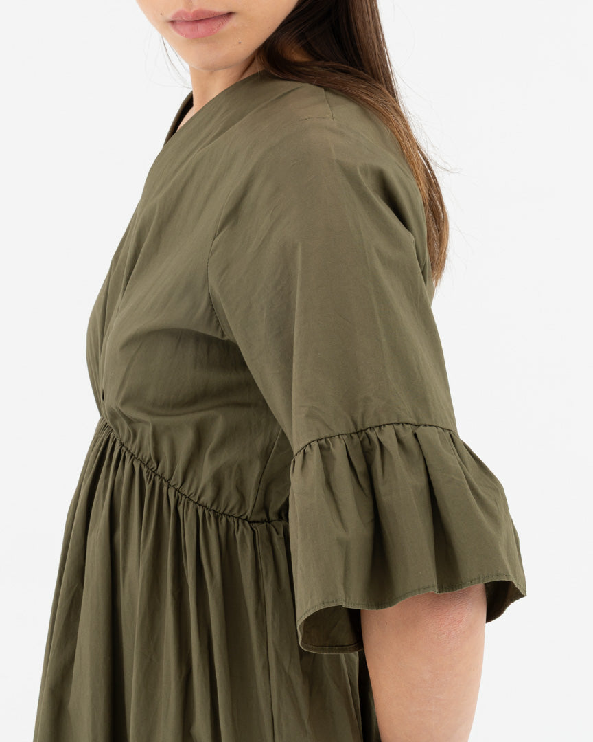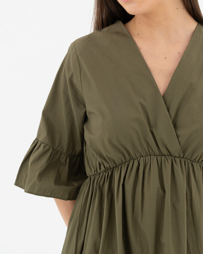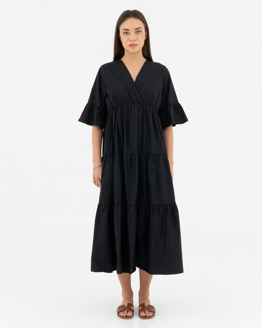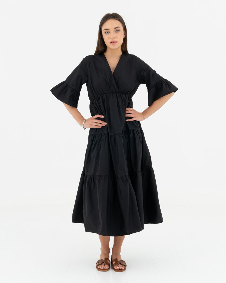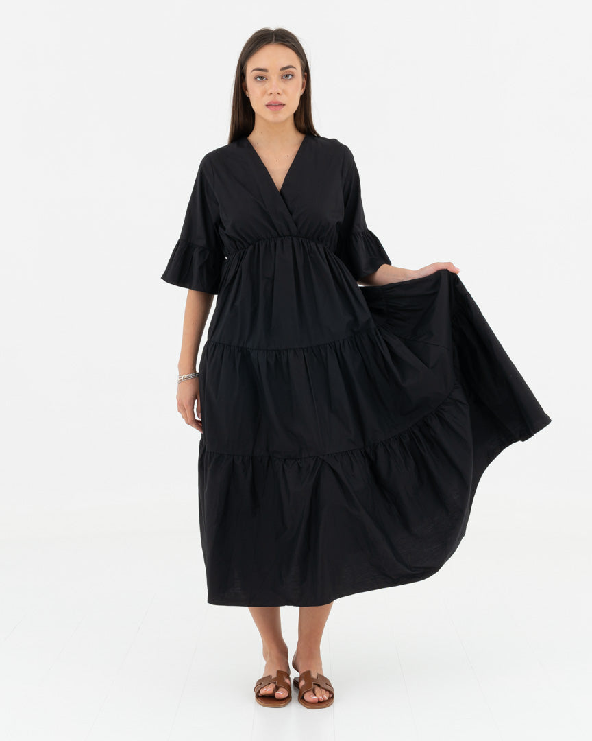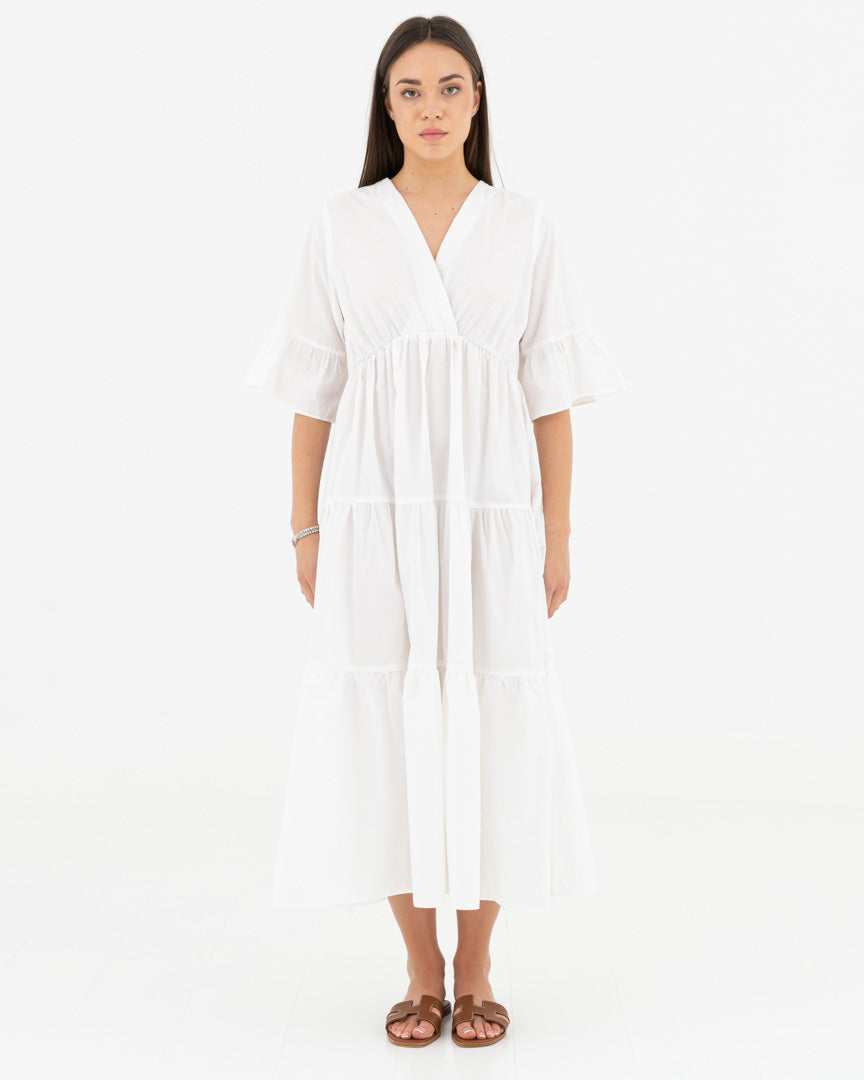 Un'eleganza leggera e senza tempo caratterizza questo abito in cotone, pensato per accompagnare con stile le giornate più calde. La gonna a balze crea movimento e volume, offrendo un’armonia visiva romantica e dinamica. Lo scollo a V slancia la figura e incornicia delicatamente il décolleté, mentre la mezza manica a campana aggiunge un tocco femminile, perfetto per chi ama i dettagli ricercati ma discreti. Leggero, traspirante e incredibilmente versatile, è il capo ideale per passeggiate in città, eventi informali o vacanze al sole. Basta un paio di sandali intrecciati o accessori in paglia per completare un look chic e disinvolto.